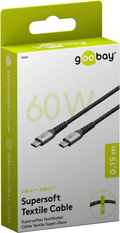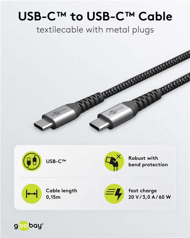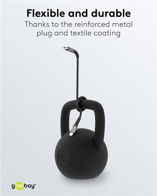 - Pleciona tekstylna powłoka kabla ładującego Goobay Type-C jest przyjemna w dotyku i delikatna dla wrażliwych powierzchni