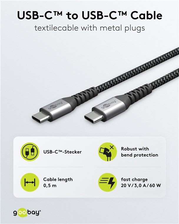 - Pleciona tekstylna powłoka kabla ładującego Goobay Type-C jest przyjemna w dotyku i delikatna dla wrażliwych powierzchni.