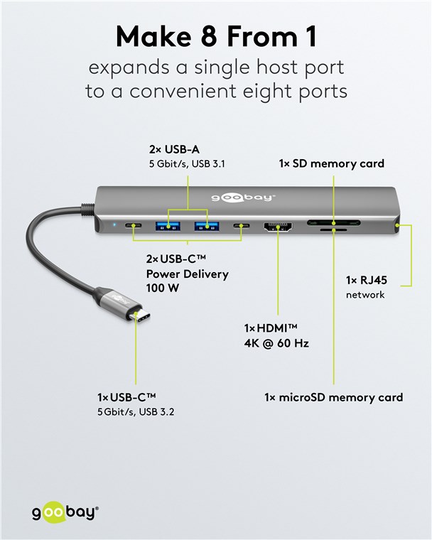 - Praktyczny USB-C™ hub rozszerza jeden port USB-C™ do osiem portów: Pojedynczy port tabletu lub laptopa może obsługiwać do ośmiu urządzeń peryferyjnych