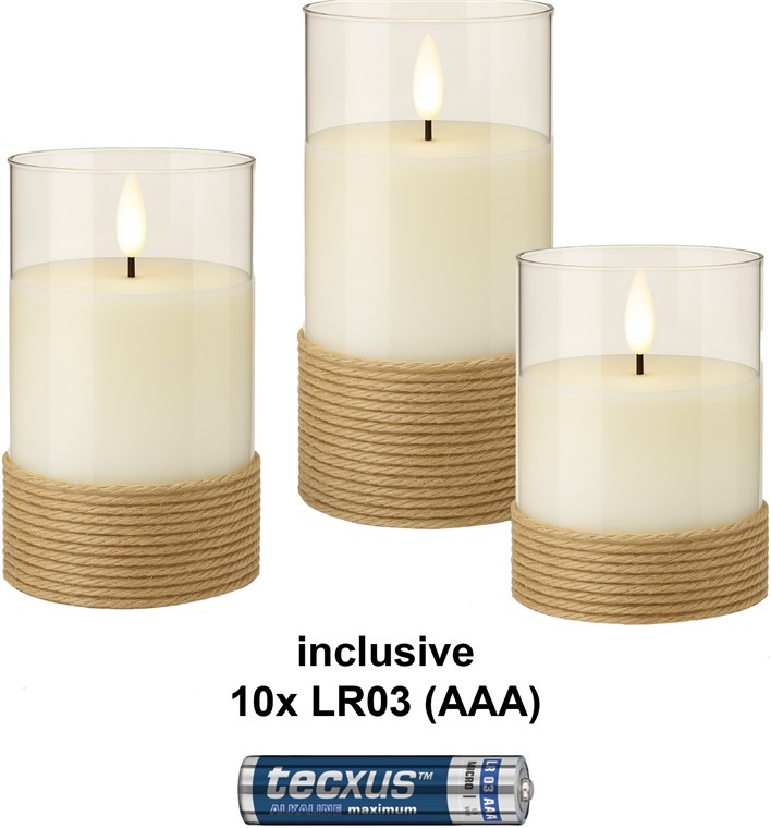 Trzyelementowy zestaw świec LED z prawdziwego wosku w szklance, biały, owinięty konopiami, z 8x AA (LR6)