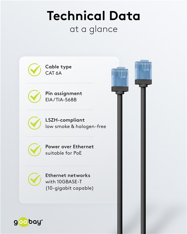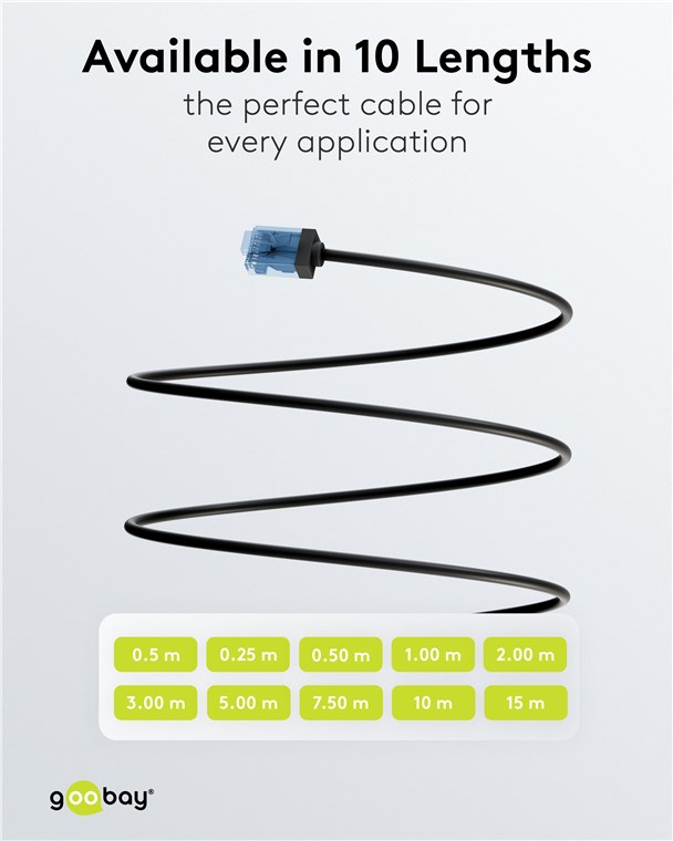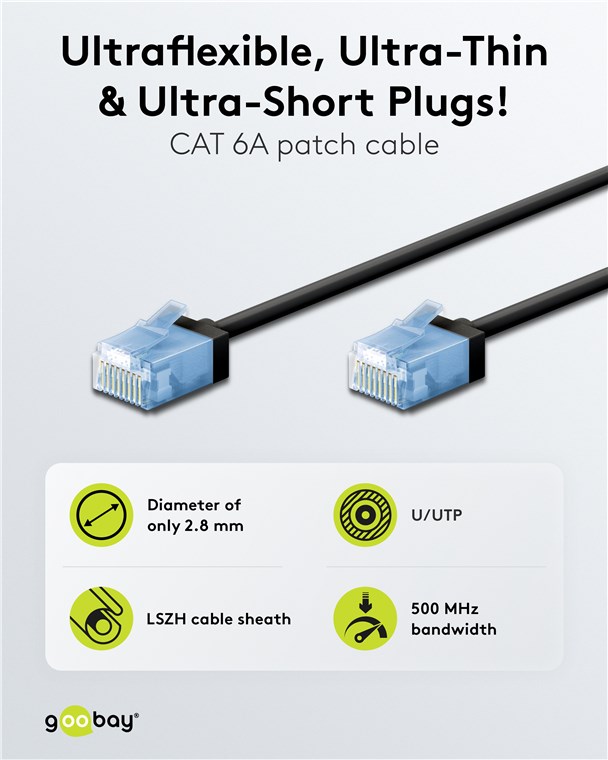 - Supercienki kabel LAN z bardzo krótkimi złączami RJ45 zapewnia mniejszą objętość kabla w szafie serwerowej lub panelu krosowym, a tym samym optymalną cyrkulację powietrza