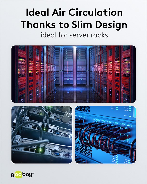 - Supercienki kabel LAN z bardzo krótkimi złączami RJ45 zapewnia mniejszą objętość kabla w szafie serwerowej lub panelu krosowym, a tym samym optymalną cyrkulację powietrza