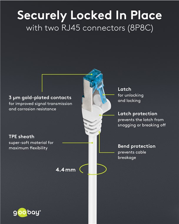 - Pewne zatrzasnięcie: Osłona zatrzasku na wtyczce RJ45 zapobiega zaczepianiu się lub odłamaniu zatrzasku