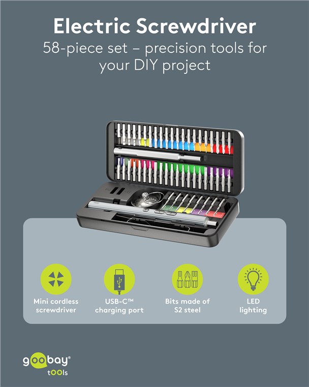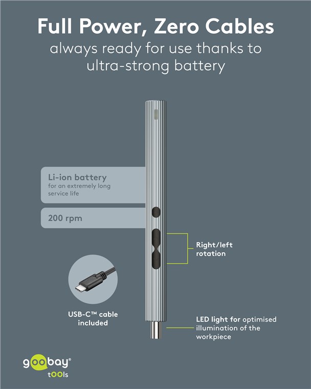 - Śrubokręt z złączem USB-C™ do ładowania, w zestawie kabel ładujący 0,5 m (USB-C™ do USB-A)