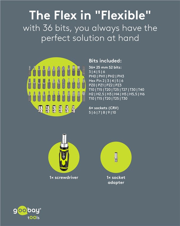 - W zestawie 1x adapter do klucza nasadowego, 6x kluczy nasadowych (5–10 mm, CRV) i 36 bitów z odpornej na uderzenia stali S2: 4x płaski, 8x krzyżakowych (PH, PZ), 12x sześciokątny (H, Hex Pin), 12x sześciokątny (T, TH)