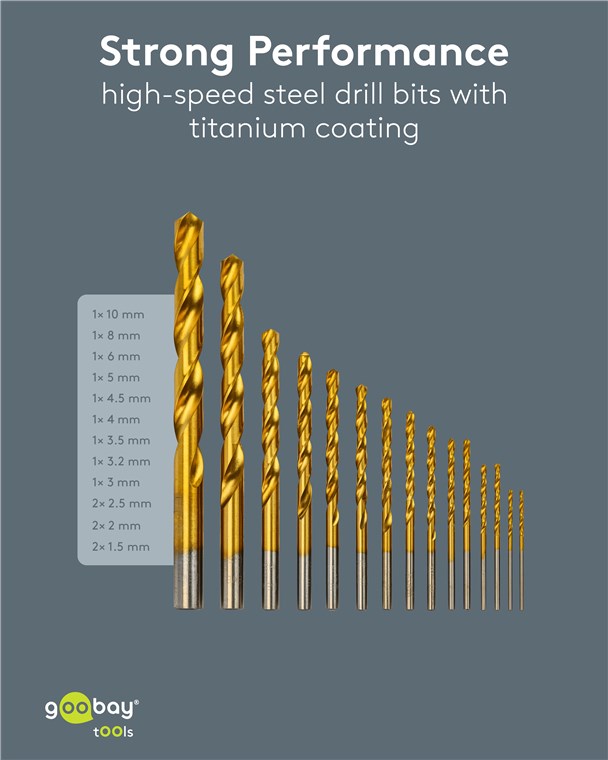 - 15x wierteł do metalu ze stali szybkotnącej (HSS) z powłoką tytanową i średnicami 2x 1,5 mm, 2x 2 mm, 2x 2,5 mm, 3 mm, 3,2 mm, 3,5 mm, 4 mm, 4,5 mm, 5 mm, 6 mm, 8 mm, 10 mm